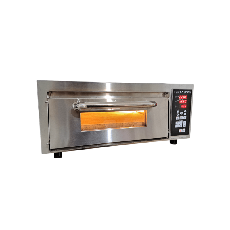 Der elektrische Pizzaofen Tentazione MAX mit GT3-Technologie sorgt für eine bessere Wärmerückstrahlung und gleichmäßigeres Backen. Er heizt sich schnell auf und erreicht die gewünschte Backtemperatur zwischen den Pizzen in Sekundenschnelle wieder. Der Ofen ist mit einer elektronischen Steuerung mit 6 Backprogrammen ausgestattet. Sie ermöglicht die unabhängige Steuerung des oberen und unteren Heizelements, sodass man die Temperatur genau an die Art der Speisen anpassen kann. Die Temperatur in der Backkammer und am Boden des Ofens wird kontinuierlich angezeigt, wodurch man den Backvorgang stets unter Kontrolle hat.